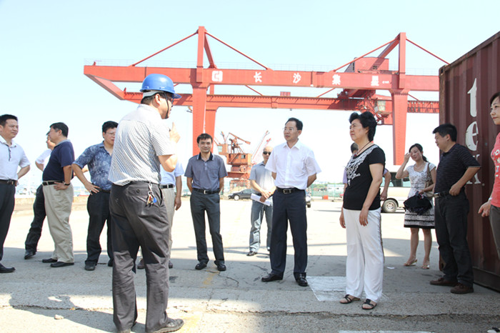 圖為長(zhǎng)沙集星集裝箱碼頭有限公司總經(jīng)理助理周勇(前左一)在向長(zhǎng)沙市政協(xié)黨組副書記、副主席鐘新蓮(前右一)、長(zhǎng)沙市開福區(qū)區(qū)委書記李蔚(前右二)介紹長(zhǎng)沙新港目前的集裝箱業(yè)務(wù)情況。 2013年7月11日上午,長(zhǎng)沙市政協(xié)黨組副書記、副主席鐘新蓮在長(zhǎng)沙市開福區(qū)區(qū)委書記李蔚的陪同下,就現(xiàn)代物流業(yè)發(fā)展情況來長(zhǎng)沙新港視察調(diào)研。湖南長(zhǎng)沙新港有限責(zé)任公司董事、財(cái)務(wù)總監(jiān)趙赤書,長(zhǎng)沙集星集裝箱碼頭有限公司總經(jīng)理助理周勇出席接待。鐘新蓮副主席對(duì)港口建設(shè)及港口目前的發(fā)展情況等一系列問題進(jìn)行了深入考察。 |