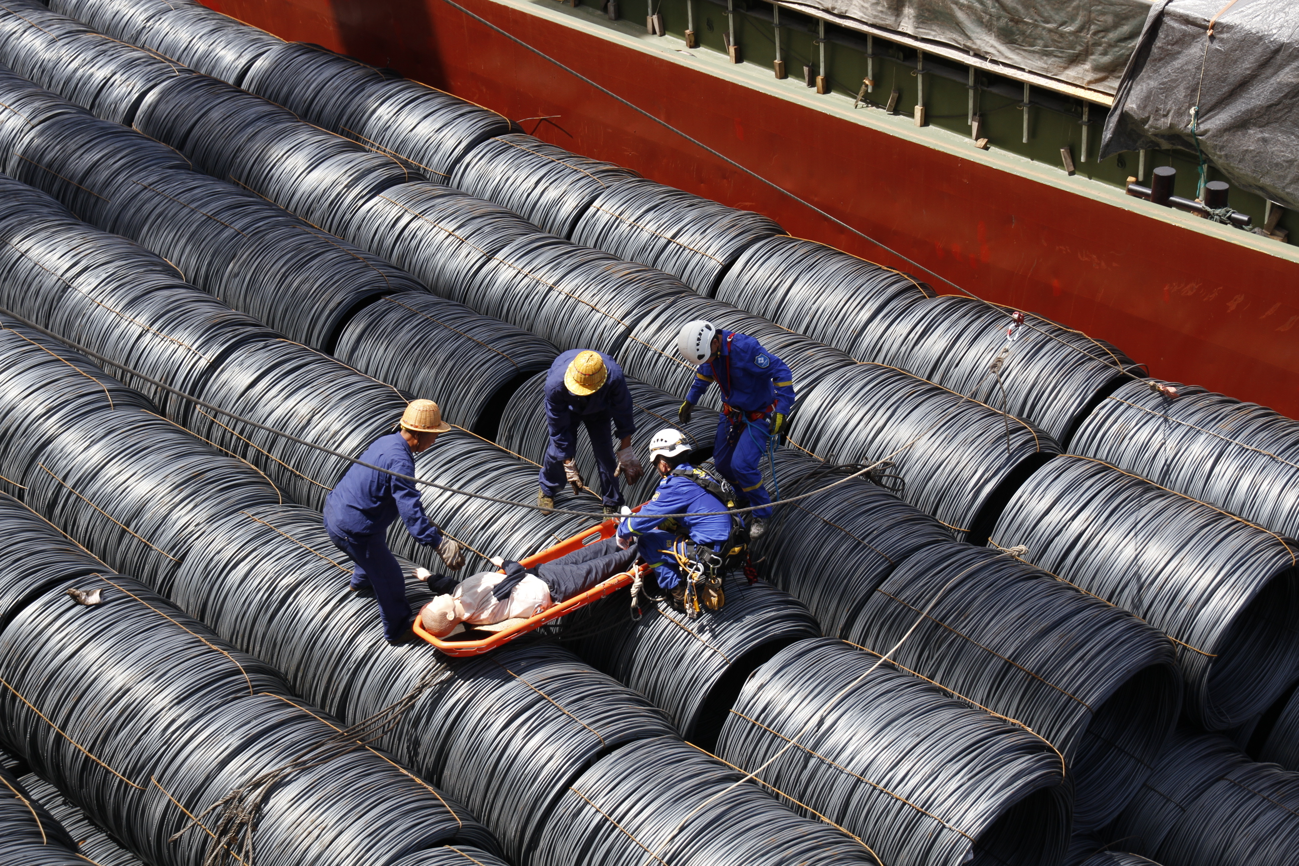 藍(lán)天救援隊員將受傷裝卸工固定在擔(dān)架上,準(zhǔn)備救援上岸。