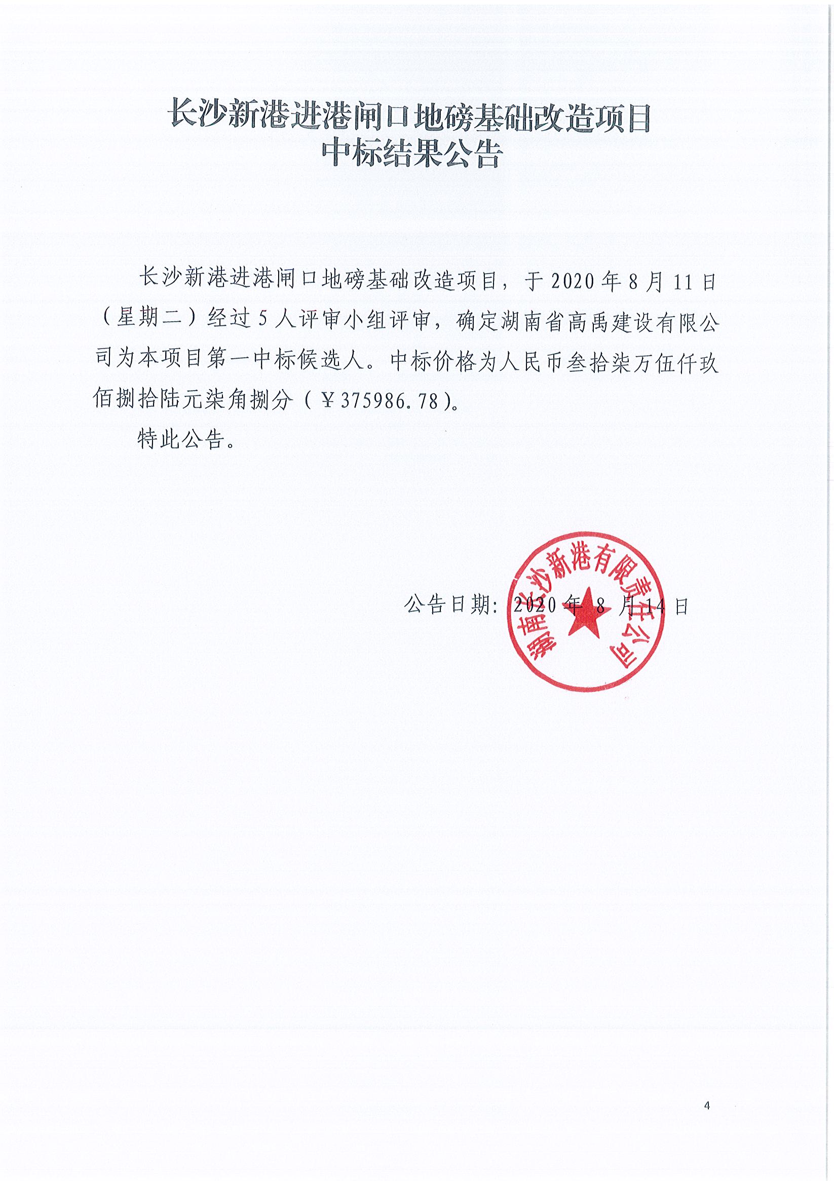 長(zhǎng)沙新港進(jìn)港閘口地磅基礎(chǔ)改造項(xiàng)目中標(biāo)結(jié)果公告