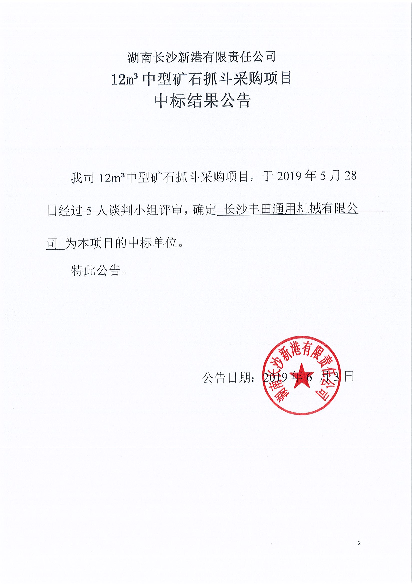 湖南長沙新港有限責(zé)任公司12m³中型礦石抓斗采購項(xiàng)目中標(biāo)結(jié)果公示